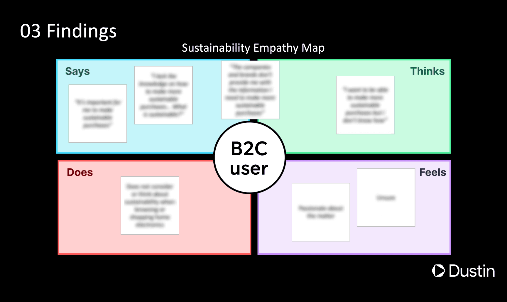 A slide from the B2C user test presentation held to stakeholders, revealing the findings related to sustainability through an empathy map. Details blurred because of confidentiality.